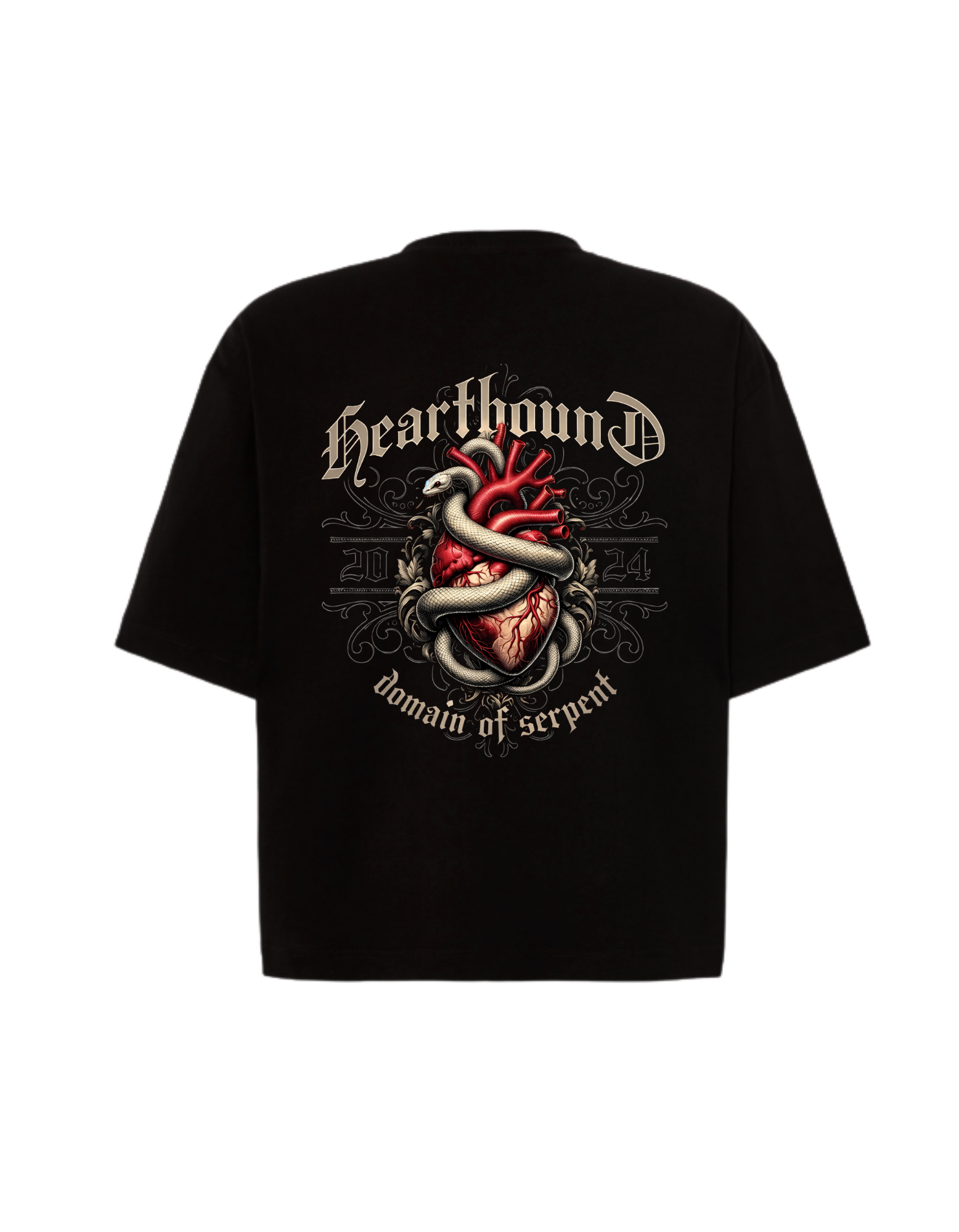 Camiseta oversize de manga corta con corte over boxy, diseñada para transmitir fuerza, tensión y lealtad a lo que se siente. Heartbound representa el corazón atrapado, protegido y amenazado al mismo tiempo. Un vínculo intenso del que no siempre se puede escapar. El diseño trasero presenta un corazón anatómico rodeado por una serpiente, símbolo de instinto, control y transformación. La composición gráfica combina tipografía gótica y ornamentos clásicos, creando una estética oscura y poderosa. En el frontal, el logo ENRALAO VIBES aparece de forma sutil, manteniendo una línea limpia y equilibrada. Una prenda con carácter, pensada para destacar sin excesos.