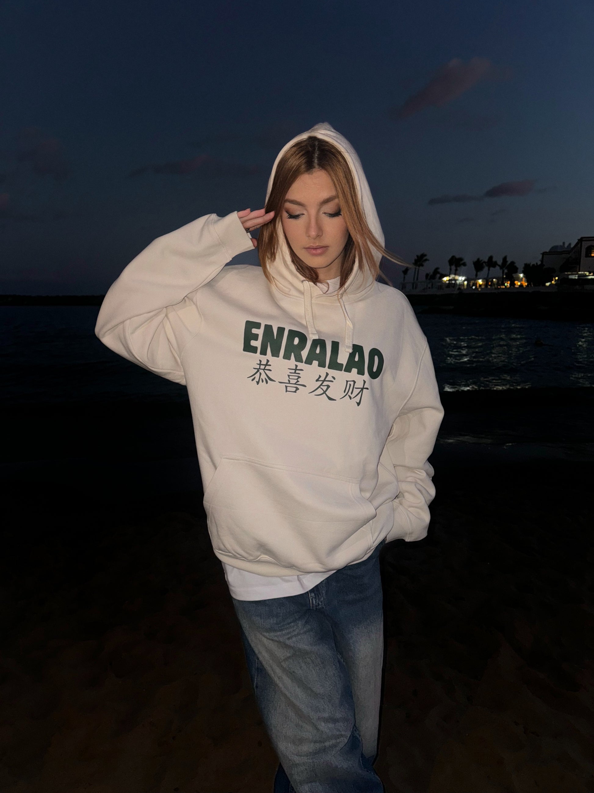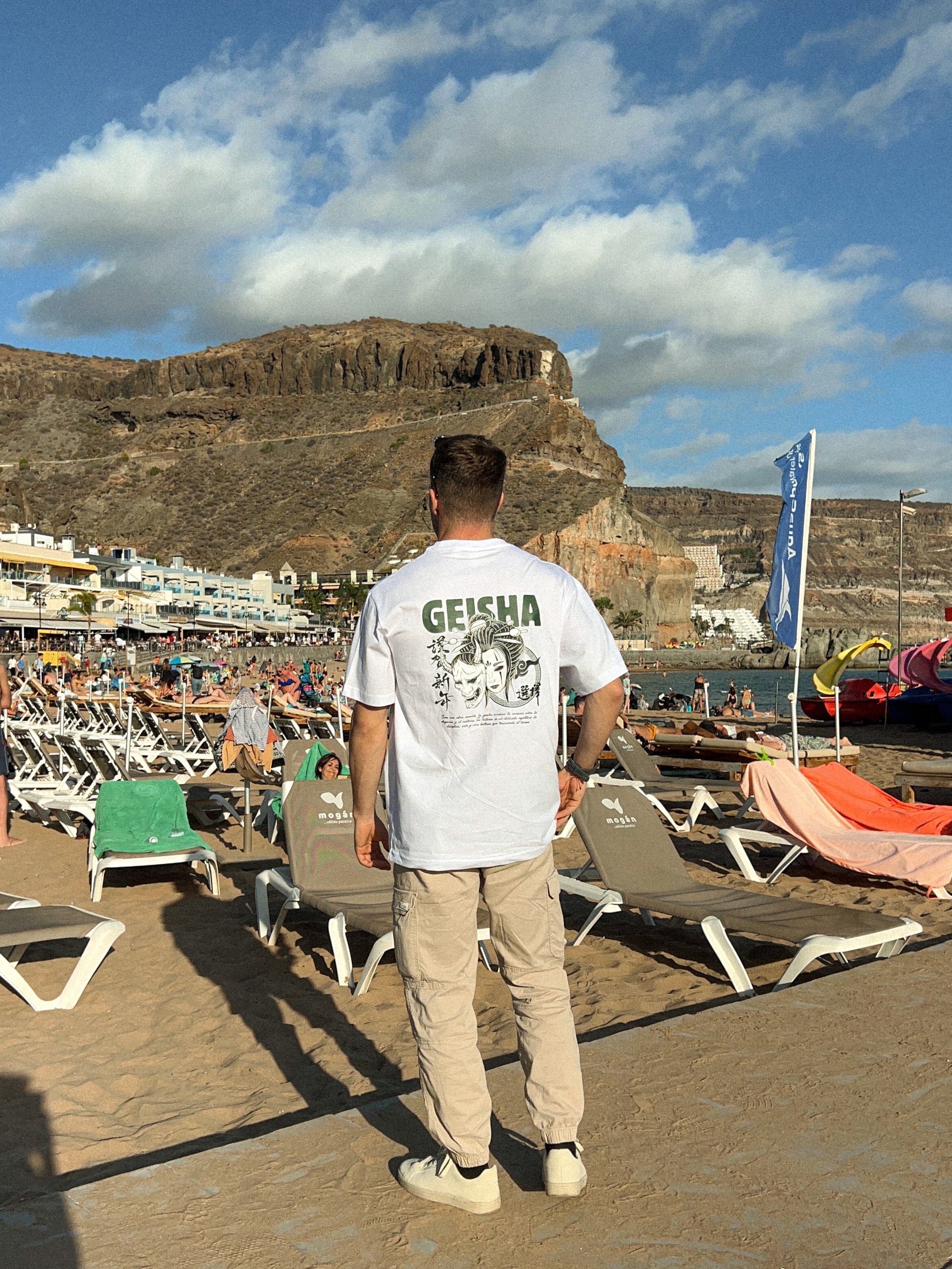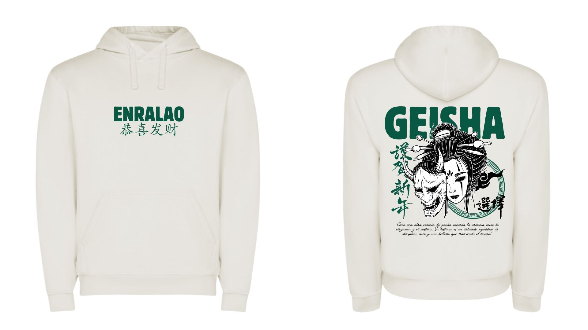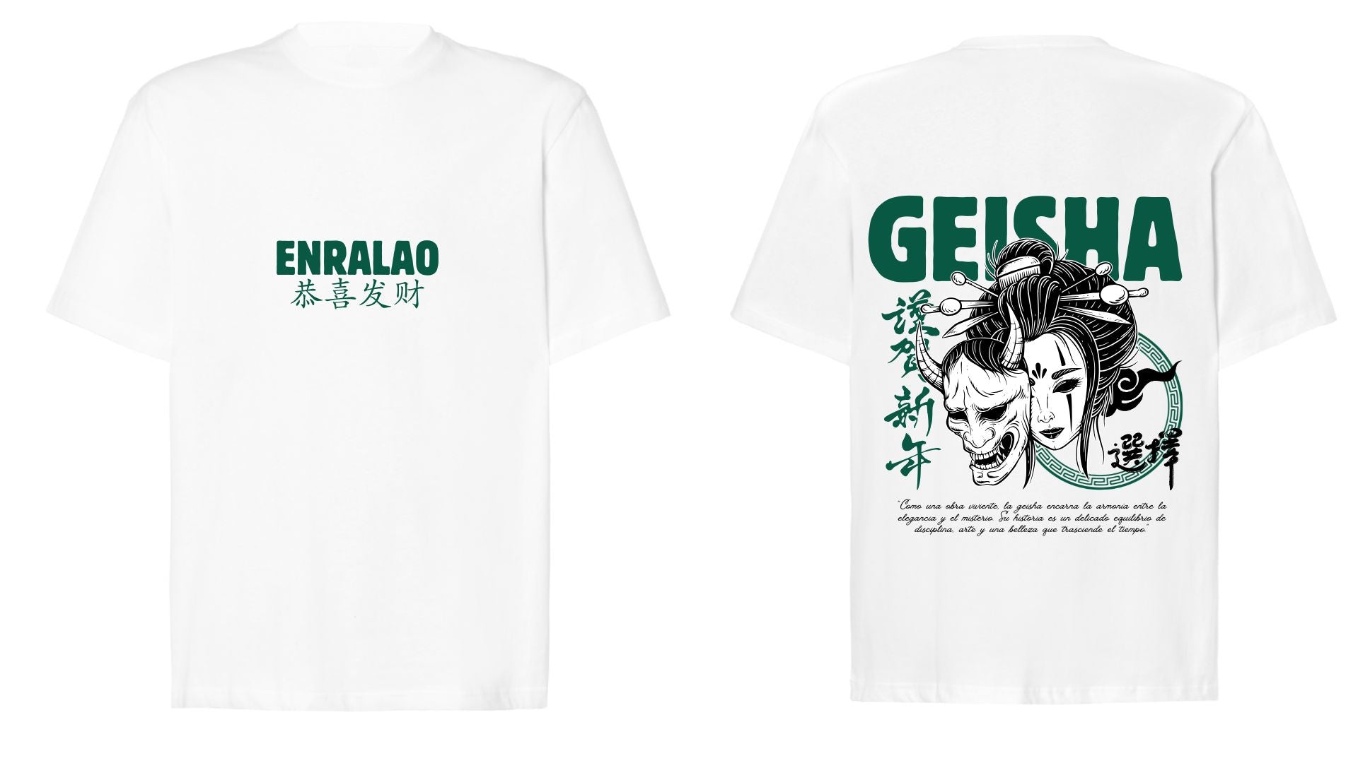 Camiseta blanca con una poderosa ilustración estilo japonés de una Geisha junto a una máscara Oni. En la parte superior de la espalda, la palabra GEISHA en verde oscuro. La sudadera mantiene el diseño minimalista al frente con el logo ENRALAO y caracteres japoneses.