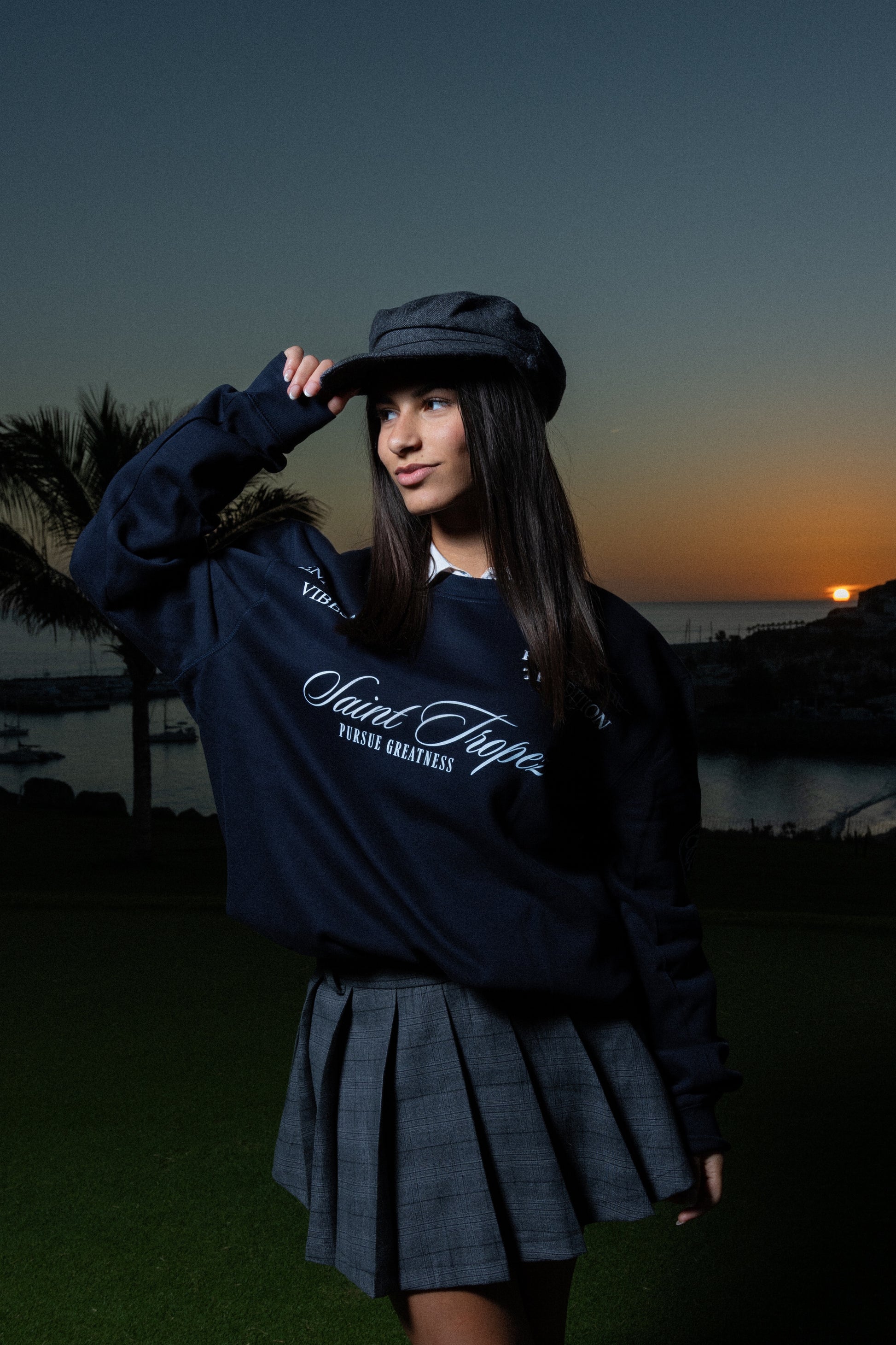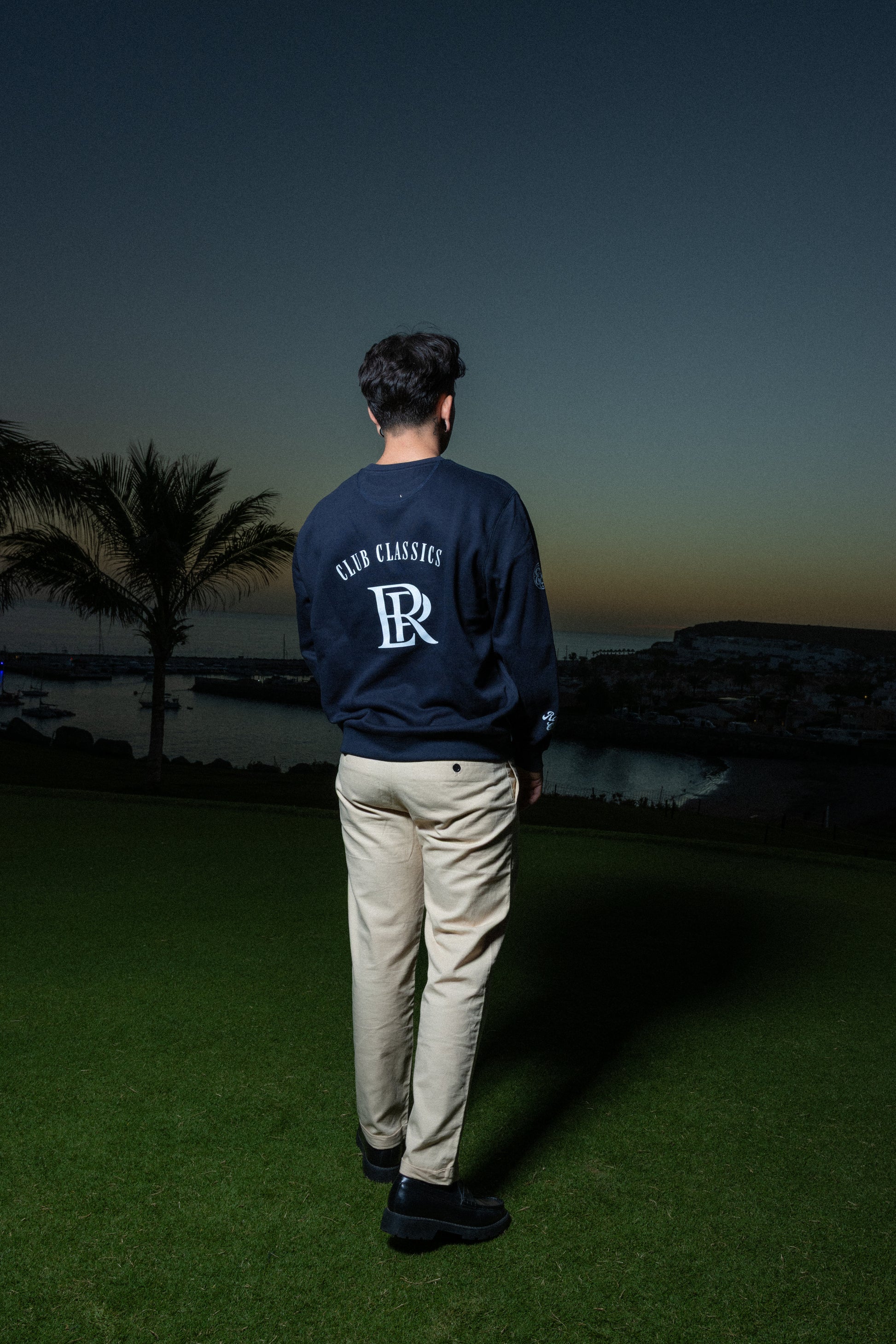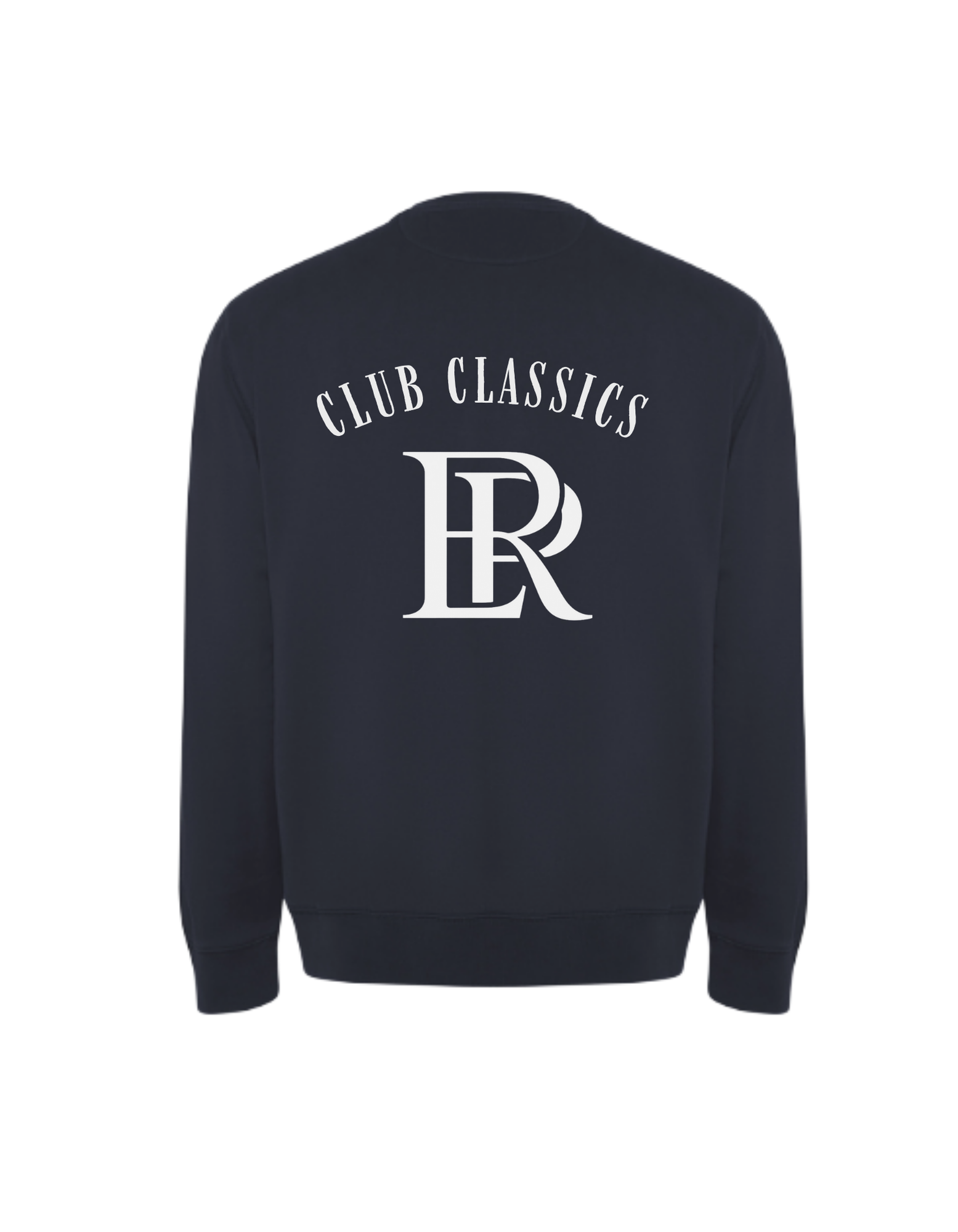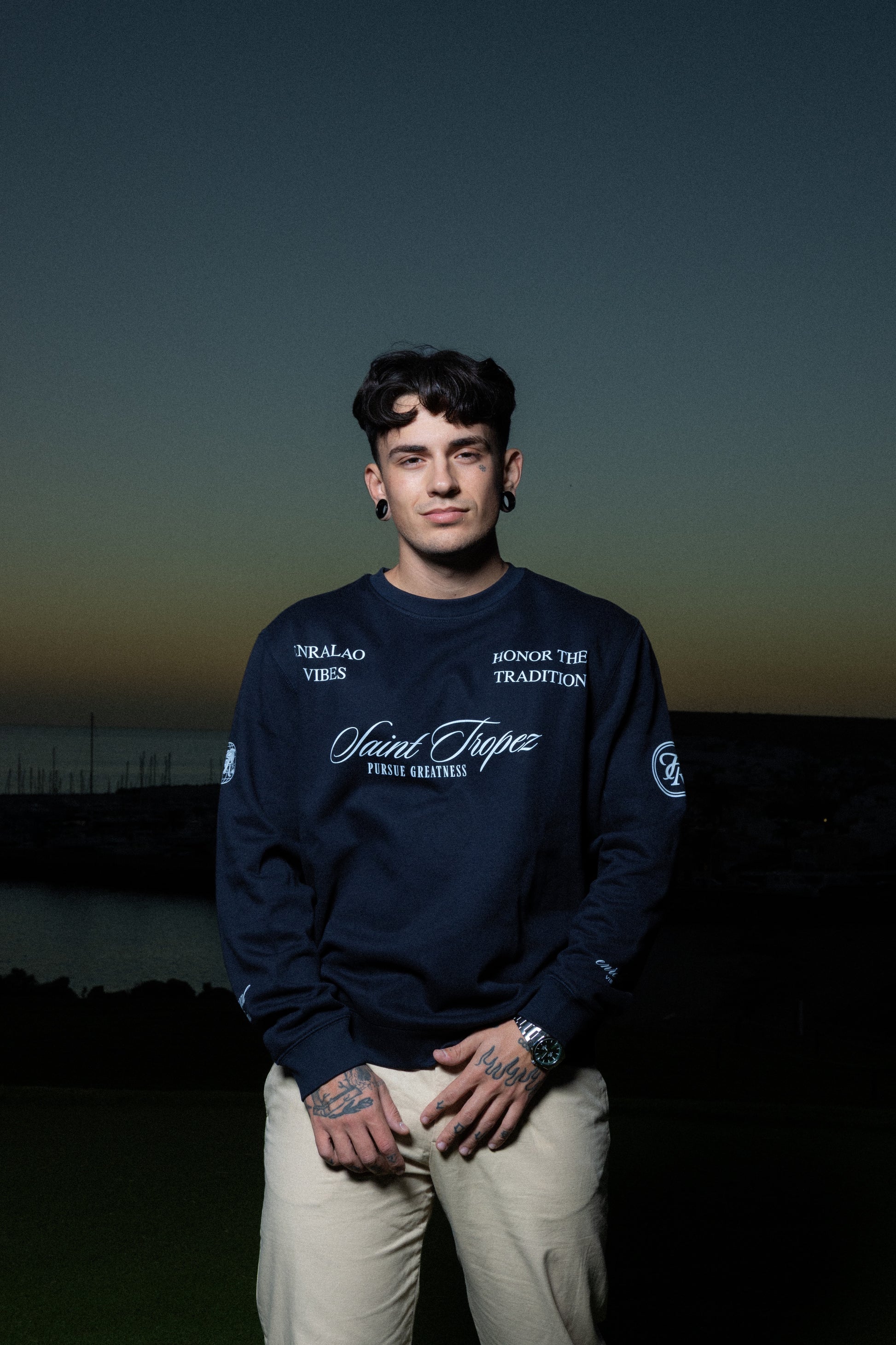 El frontal presenta una composición elegante: el sello Enralao Vibes, el lema “Honor the Tradition” y la firma Saint Tropez en estilo caligráfico, evocando lujo discreto, verano eterno y tradición elegante. En la espalda, el gran monograma ER se convierte en el protagonista, rodeado por el título Club Classics, un homenaje visual al estilo universitario premium y a los clubes privados que marcaron la historia del diseño clásico. Los detalles laterales emblemas circulares y texto editorial completan una pieza rica en carácter y personalidad.